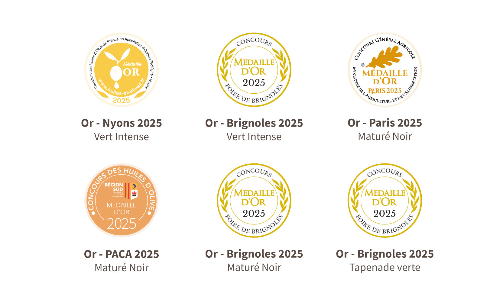 We have the honor of winning multiple medals over the years in regional, national and international competitions. From the Paris Agricultural Fair to Marseille to Nyons and even in China. Our determination to produce the highest quality olive products oil has been recognized by professional judges.